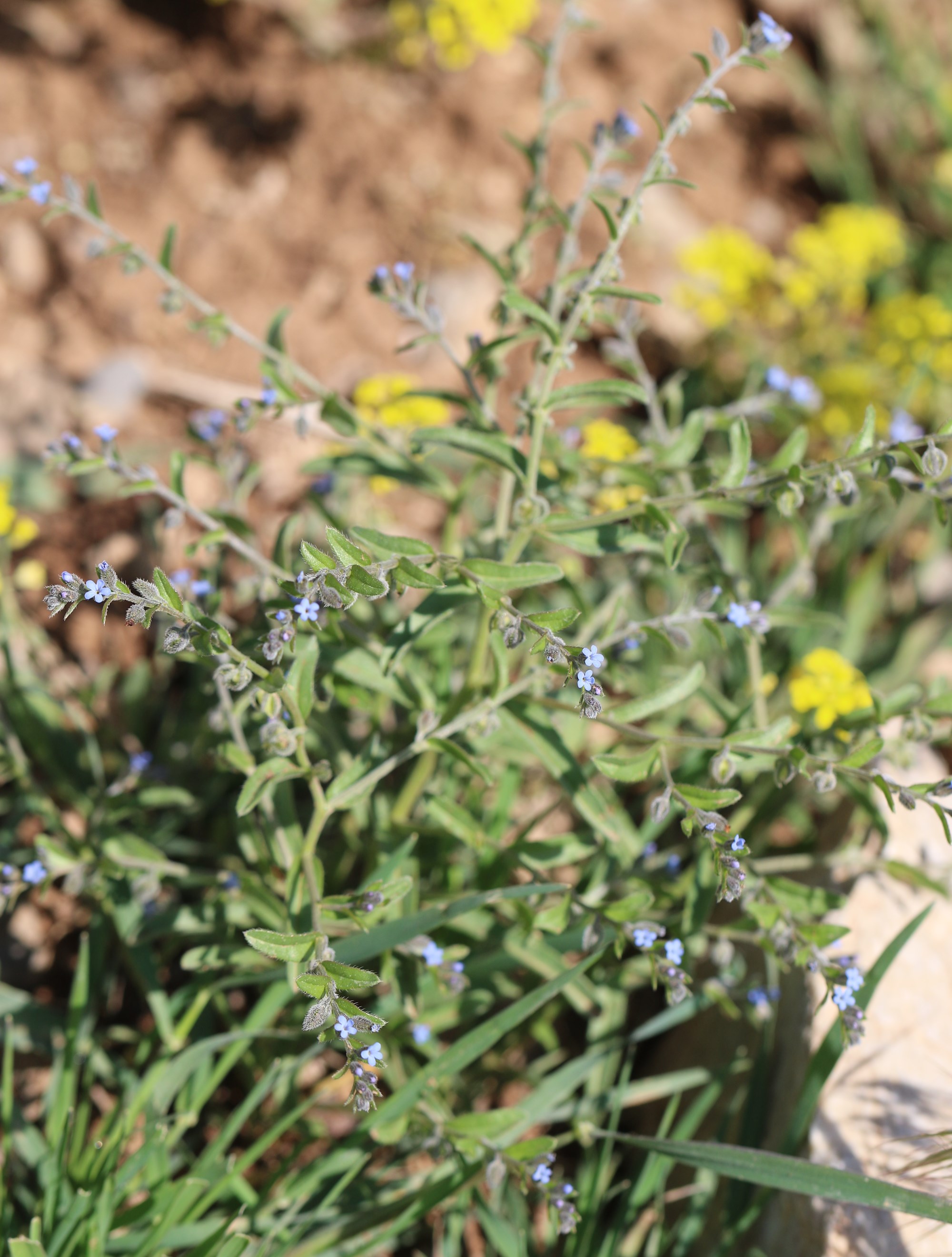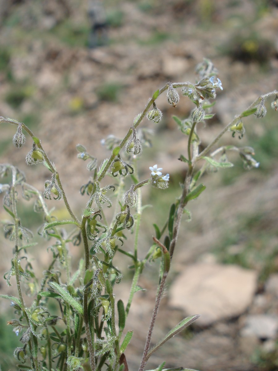 Bis 20 cm hohe Einjährige mit elliptischen, striegelhaarigen, 2−5 cm langen, bis 2 cm breiten Blättern und blattähnlichen Hochblättern. Kelch bis zum Grund geteilt, Kelchzipfel linealisch, Haare auf den Kelchzipfeln gekräuselt oder hakenhaarig. Krone 2−4 mm, stieltellerförmig, hellblau. Früchte von den Kelchzipfeln käfigartig, kugelig umgebogen. Blütezeit April bis Mai.