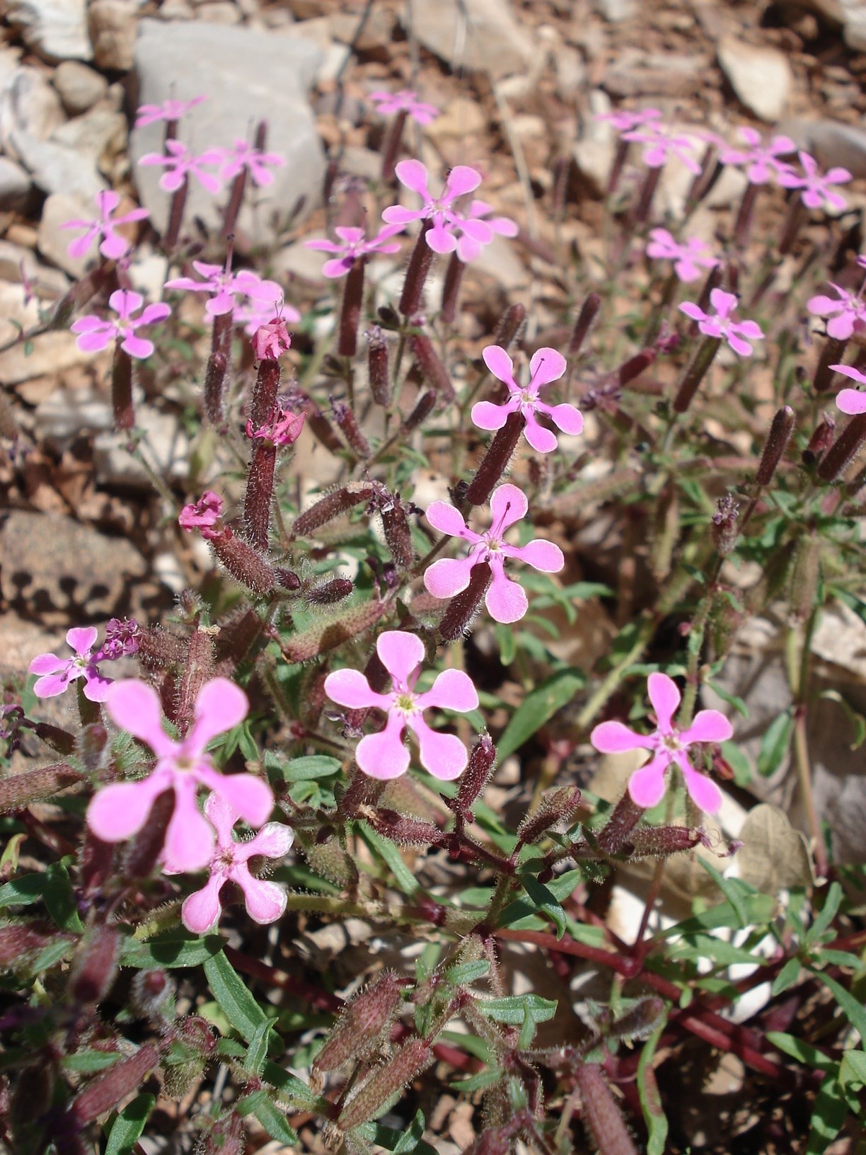 Bis 25 cm hohe, niederliegende bis aufsteigende, stark verzweigte Einjährige mit drüsig behaarten Stängeln und spateligen, sitzenden Blättern. Blütenstand rispig, Blüten zu 1−3, lang gestielt. Blütenstiele aufrecht oder abstehend, länger als der Kelch. Blüten dunkelrosa, mit Nebenkrone. Kronblattzipfel trommelschlägelförmig, Kelch zu einer Röhre verwachsen. Blütezeit Mai bis Juli.