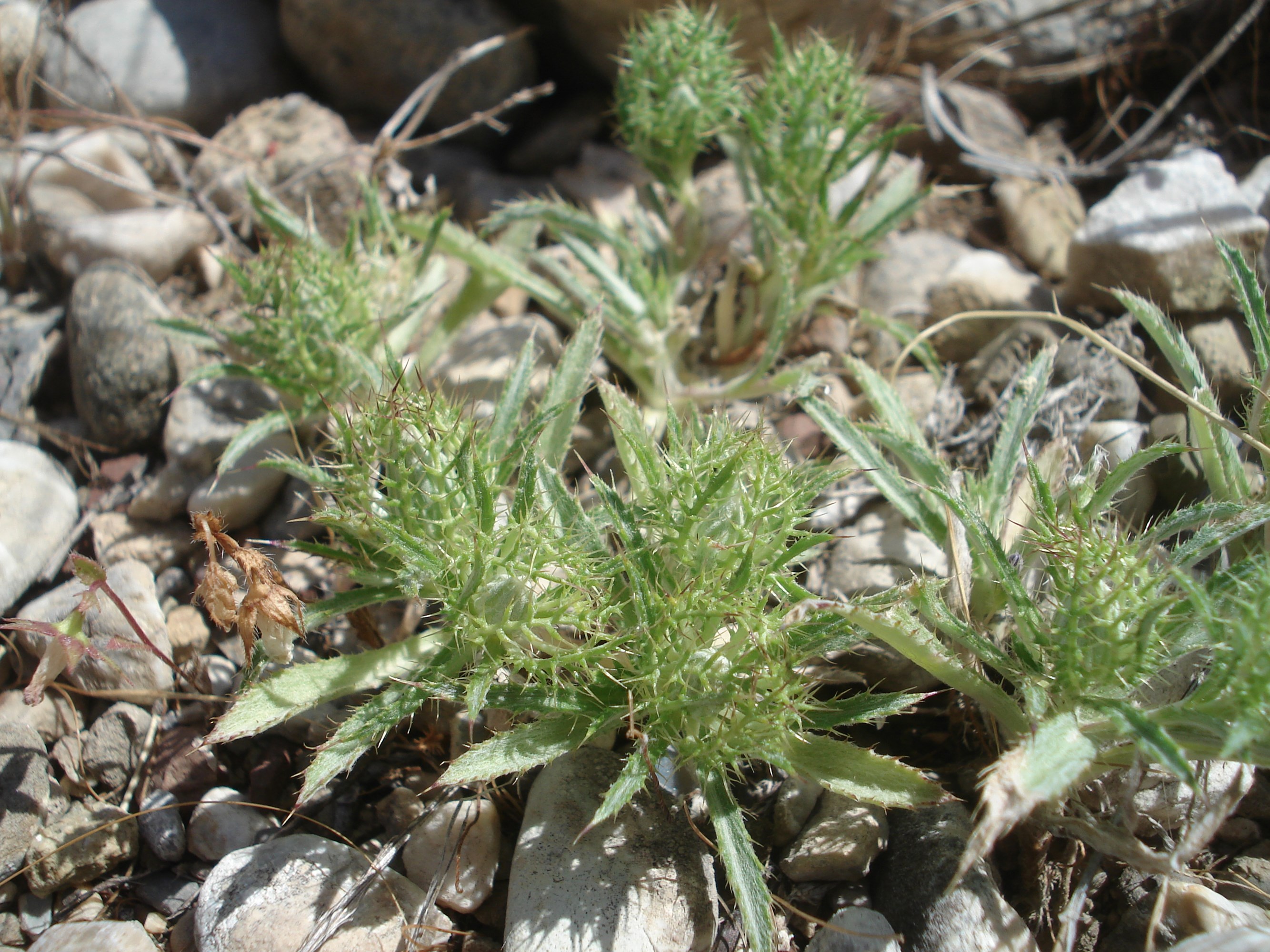 5−20 cm hohe Einjährige mit schmalen, dornig gezähnten, unterseits spinnwebig behaarten Blättern und 0,5−2 cm breiten Blütenkörben. Hüllblätter kammförmig dornig, das Köpfchen gitterartig umhüllend. Röhrenblüten fünfzählig, purpurn. Blütezeit April bis Juni.