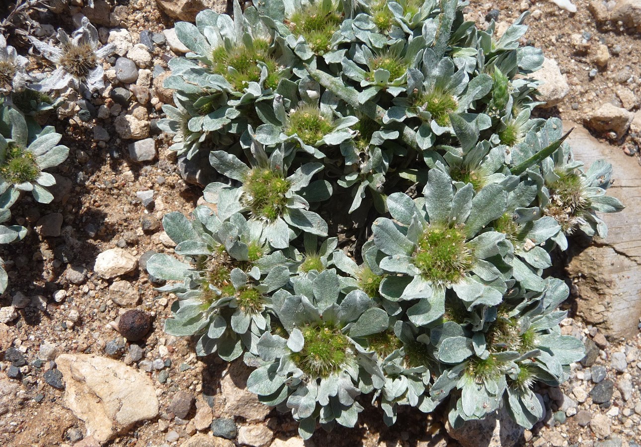 1−5 cm hohe Einjährige mit filzig behaarten, graugrünen, spatelförmigen, zu einer Rosette geformten Blättern und büschelig zusammenstehender Blütenkörbe. Blüten aus 30−40 grünen bis beigen Hüllblättern und unscheinbaren Röhrenblüten bestehend. Blütezeit April bis Juni.