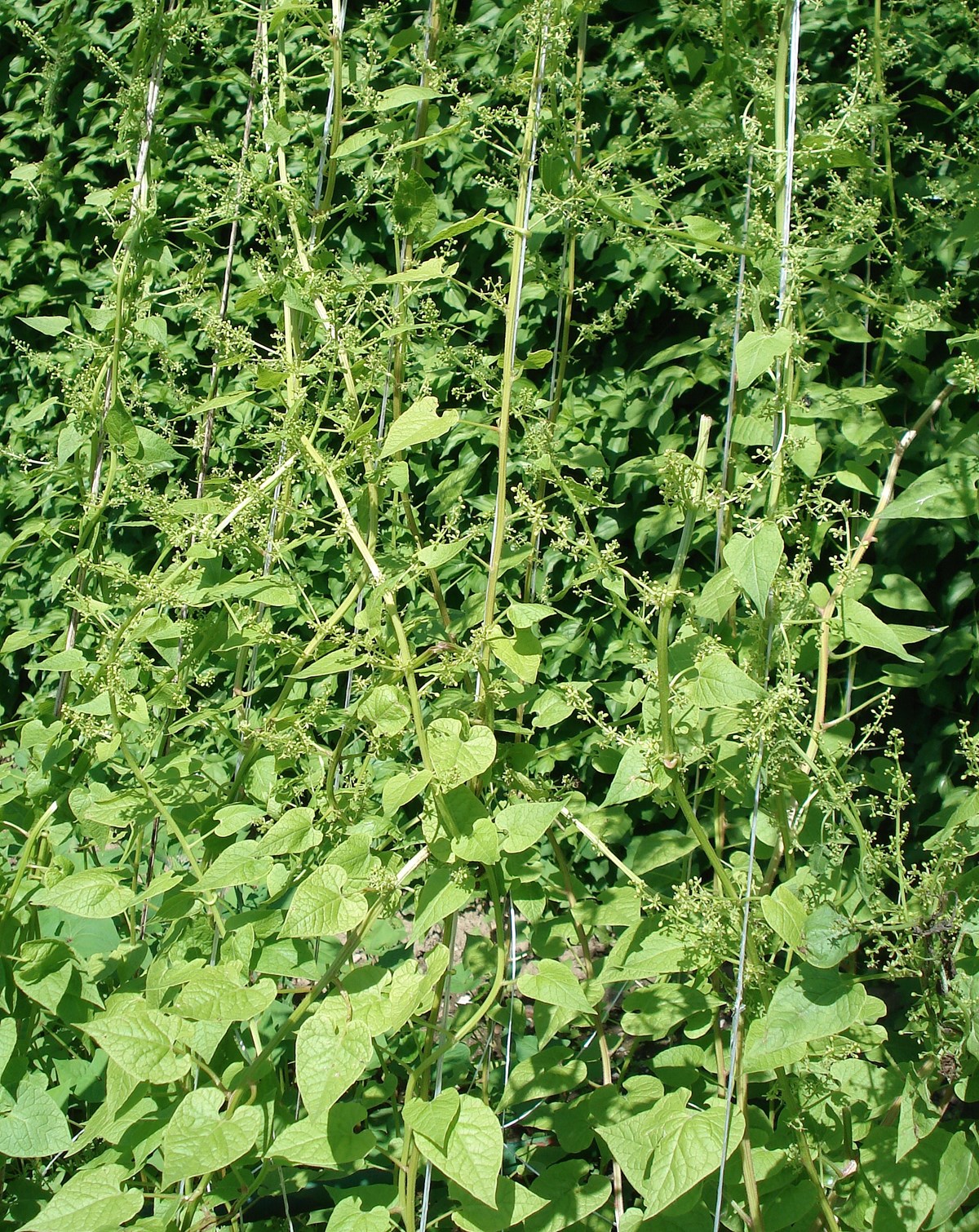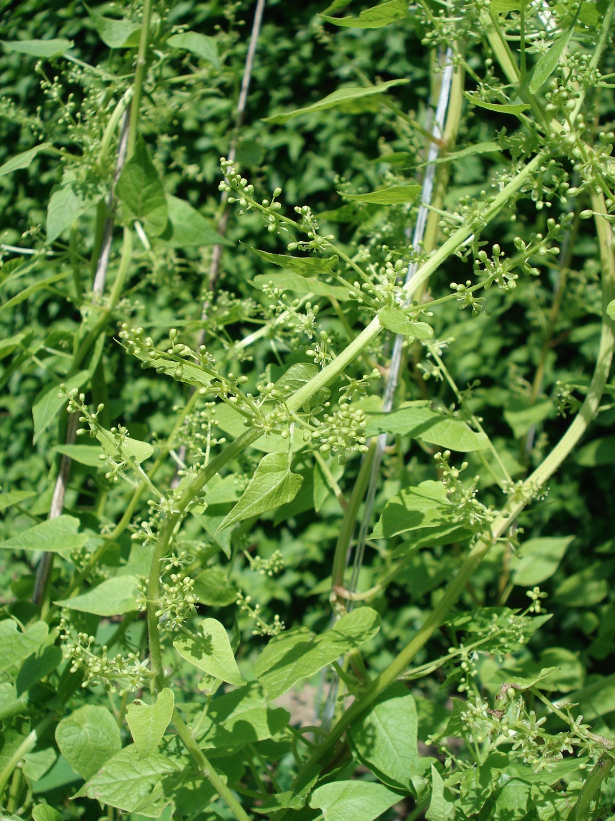 Bis 3 m hoch rankende Mehrjährige mit gerieftem, oft braunrot überlaufenem Stängel und herzförmigen, lange zugespitzten Blattspreiten. Blütenstand durchblättert, reichblütig, hängend, traubig, zur Fruchtzeit verlängert, aus winzigen, grünlichen, fünfzähligen Blüten. Kronblätter zurückgebogen oder zurückgeschlagen. Samen schwarzbraun, glatt, nierenförmig. Blütezeit Mai bis Juni.