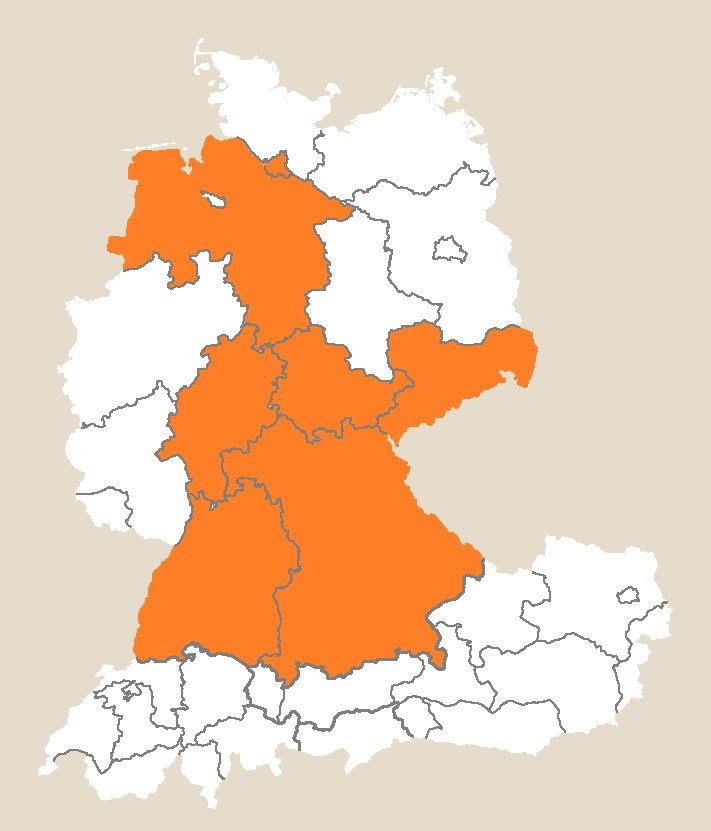 Angegeben 1886, 1892, 1898 und 1903 für Mannheim in Baden-Württemberg (Zimmermann 1910, Conert 1998, Hand & Thieme 2023), Nürnberg in Bayern (Conert 1998), Hamburg (Conert 1998, Hand & Thieme 2023), 1934 Lampertheim in Hessen (Fiedler 1936, Conert 1998, Hand & Thieme 2023), Stade in Niedersachsen (Alpers 1875, Conert 1998, Hand & Thieme 2023), 1957 bei der Wollkämmerei Leipzig in Sachsen (Gutte 2006) und für Feldfluren bei Erfurt in Thüringen (Reinecke 1919).