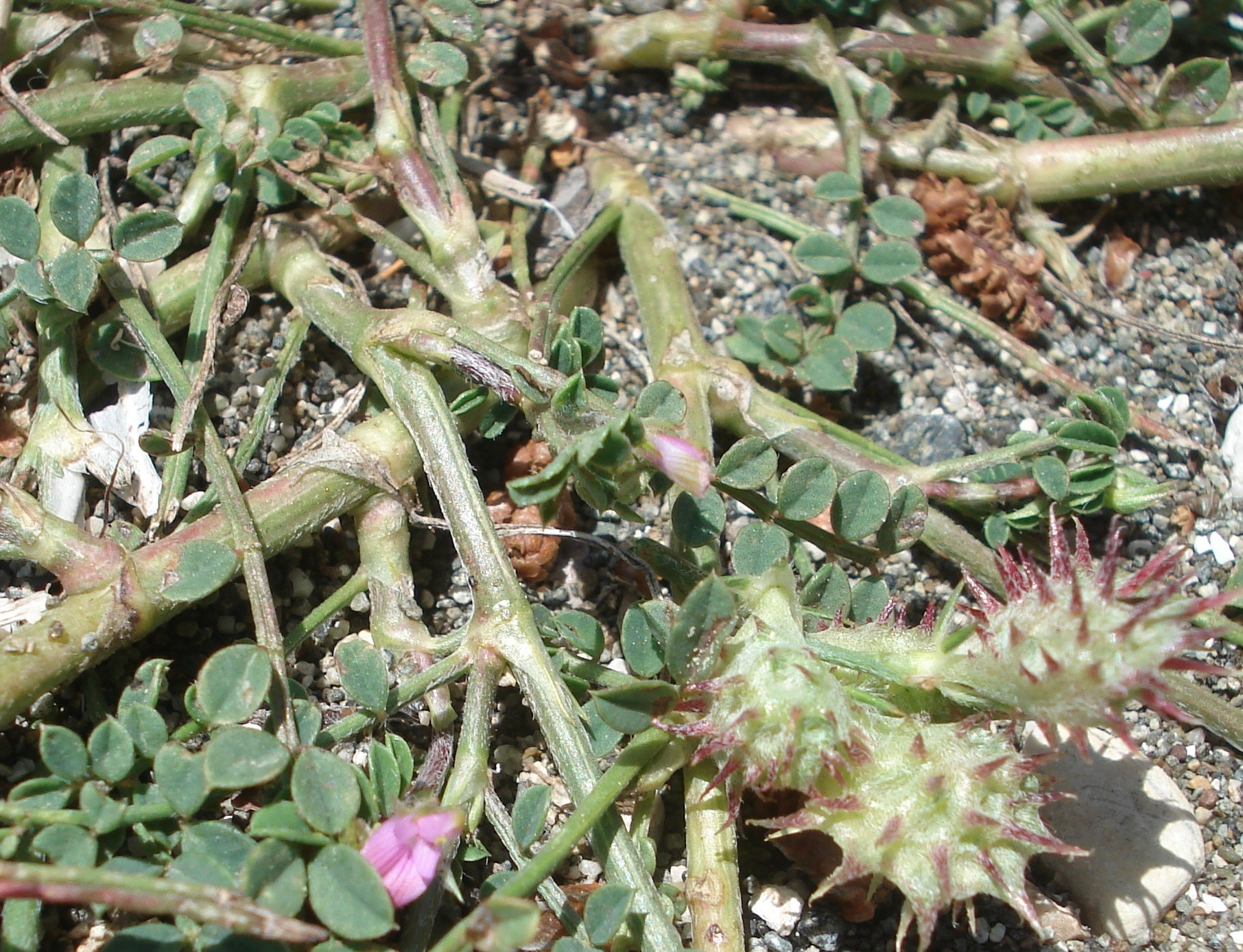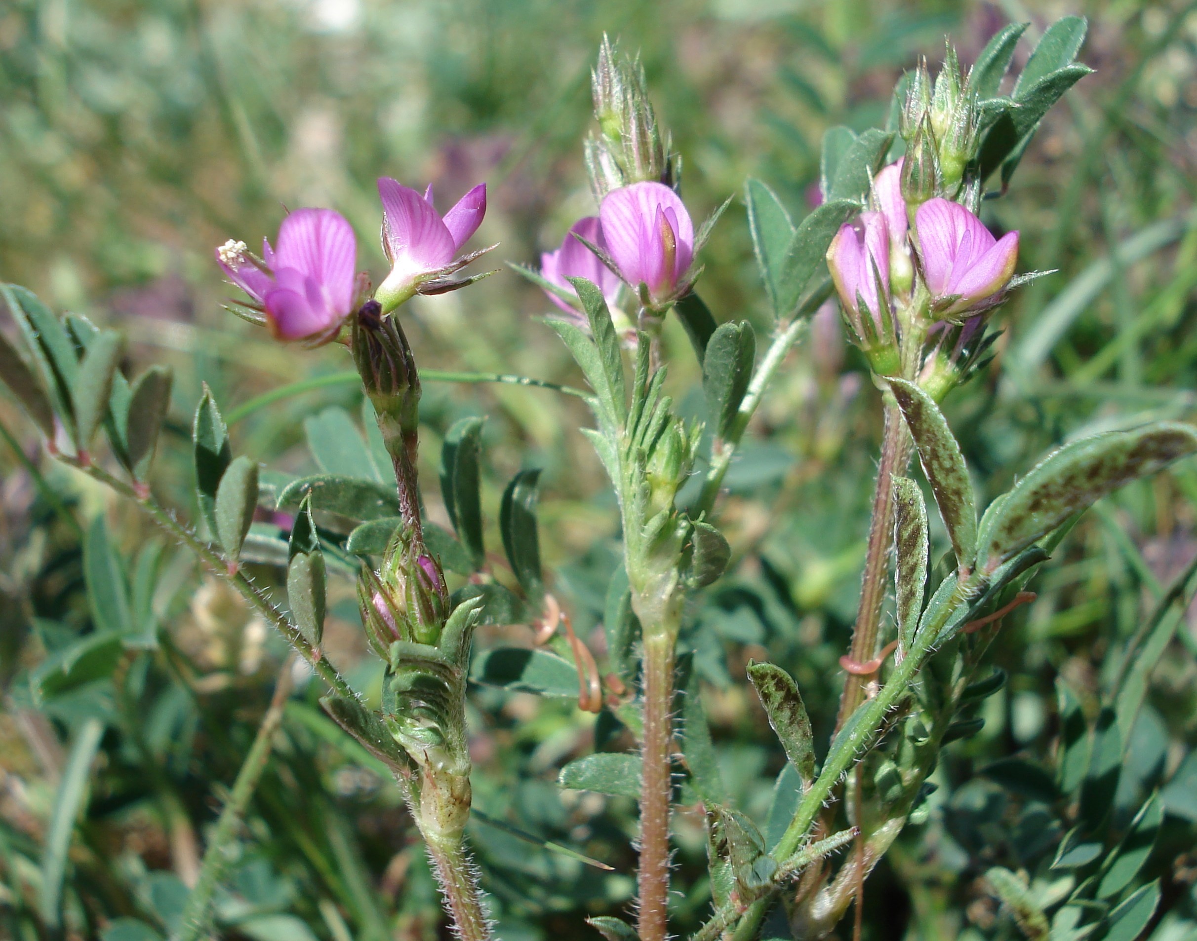 Bis 40 cm hohe Einjährige mit unpaarig gefiederten Blättern und 4−9 Fiederpaaren. Blättchen linealisch bis breit-lanzettlich, bis 20 mm lang und 6 mm breit, vorne mit einem Stachelspitzchen. Blütenstand 3−8 cm lang gestielt, mit 2 bis 8 dunkelrosa Blüten. Krone 7−8 mm lang, Flügel wenig kürzer als das Schiffchen. Kelchzähne 2−4 × so lang wie die Kelchröhre. Früchte kugelig, mit mehreren Kämmen, diese mit jeweils 4−9 Stacheln. Blütezeit April bis Juni.